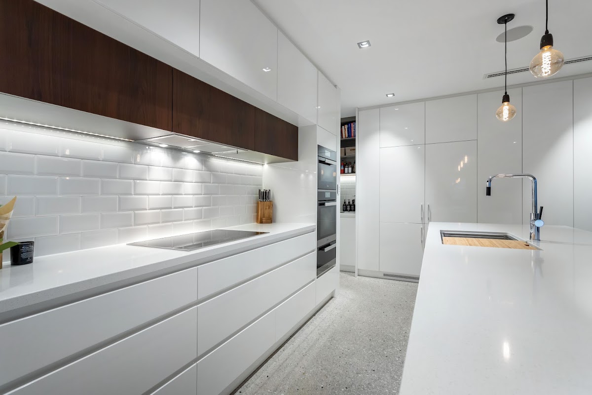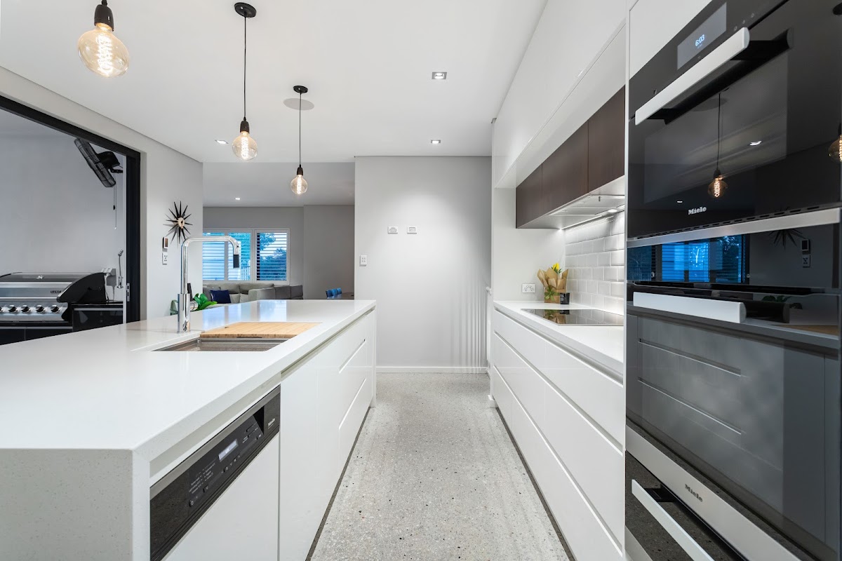 Adjacent is a big kitchen in fresh seaside whites with timber trim, featuring abundant storage and a huge walk in scullery. A central Island bench is the social hub of the home and is positioned alongside a wall of bifold doors that connect the kitchen to timber decked alfresco pool and BBQ court.