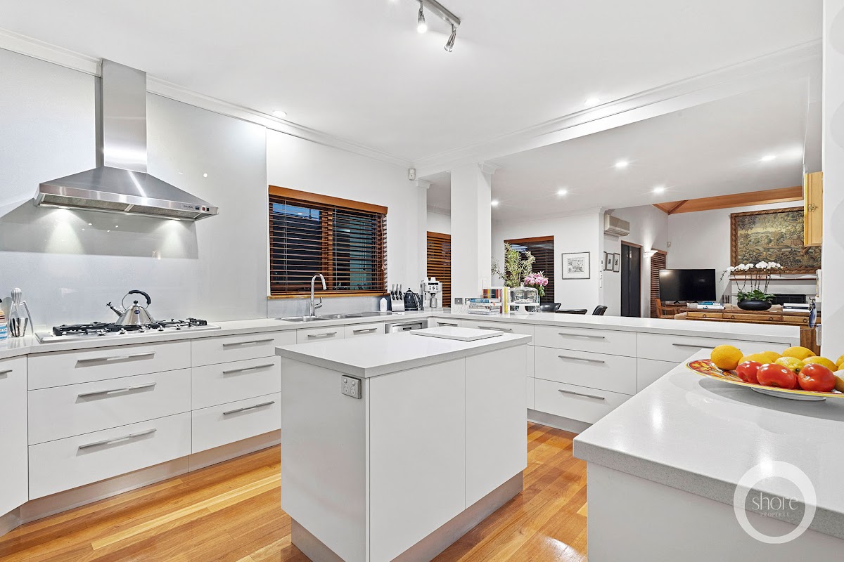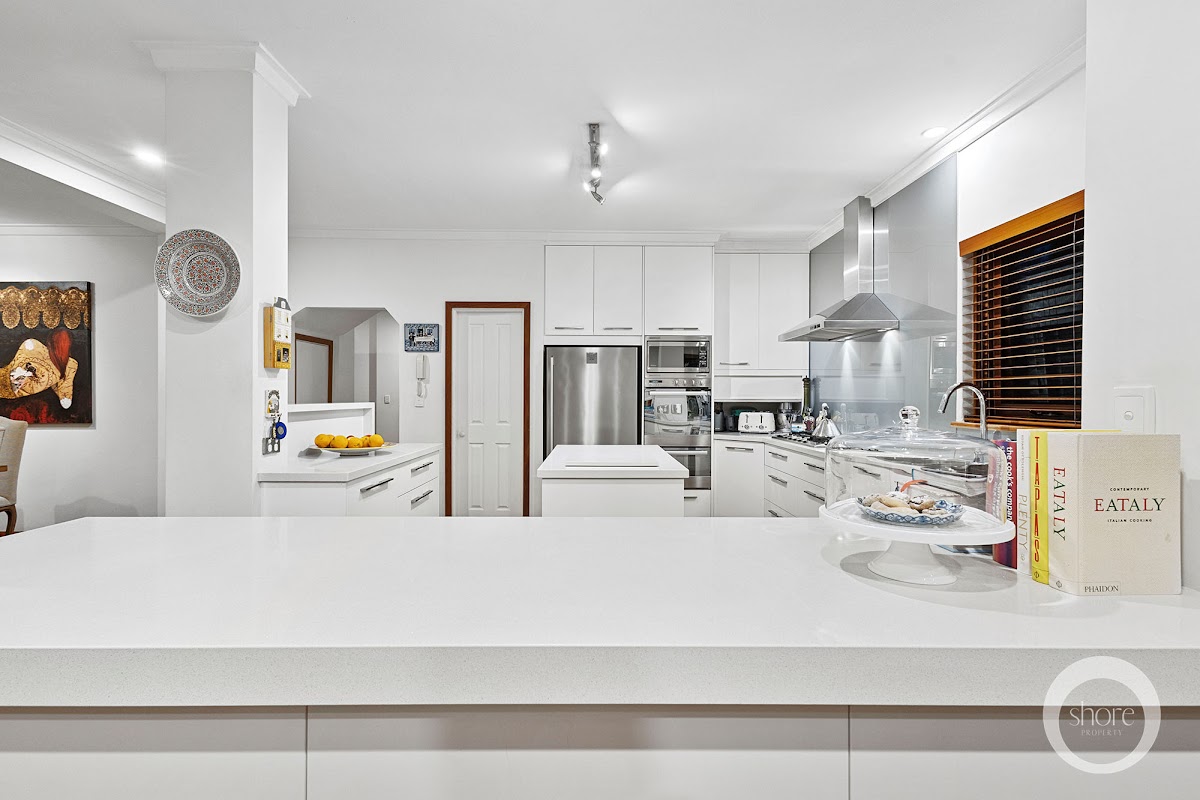 The other side takes you to a striking contemporary kitchen that is so large it is almost commercial in size. High-end appliances, abundant storage sweeping benchtops for both food preparation and family congregation are resplendent crisp sea-side whites. There’s also a central island worktop and bench.
