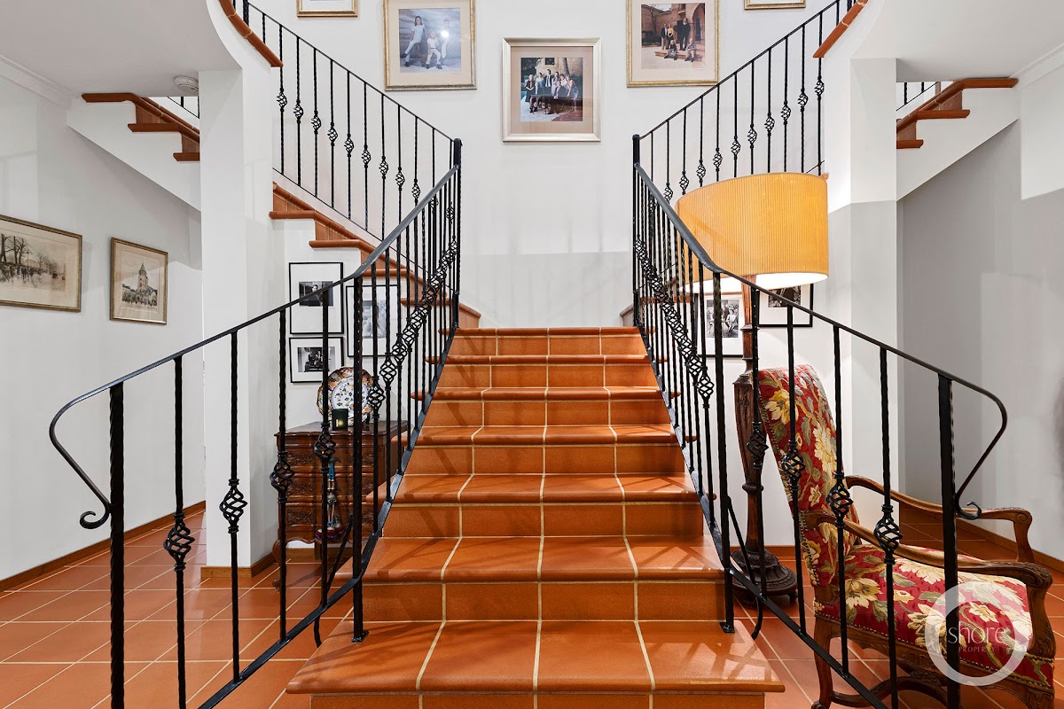 A feature central bifurcated staircase of artisan wrought iron and European terracotta, could well be the backdrop of a movie set. It splits in two directions at its midpoint landing, allowing you to climb left to the master suite or right to the minor bedroom wing.