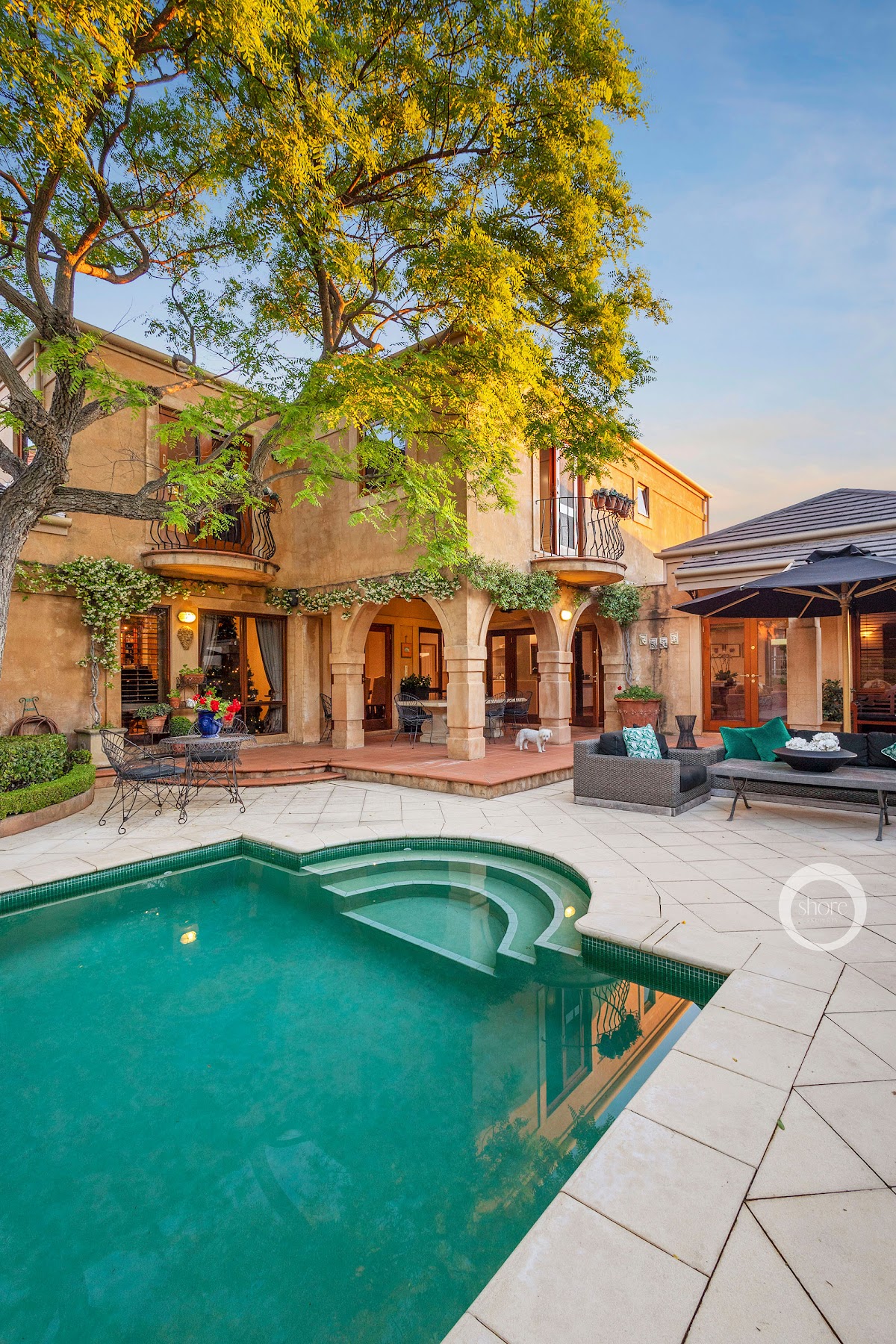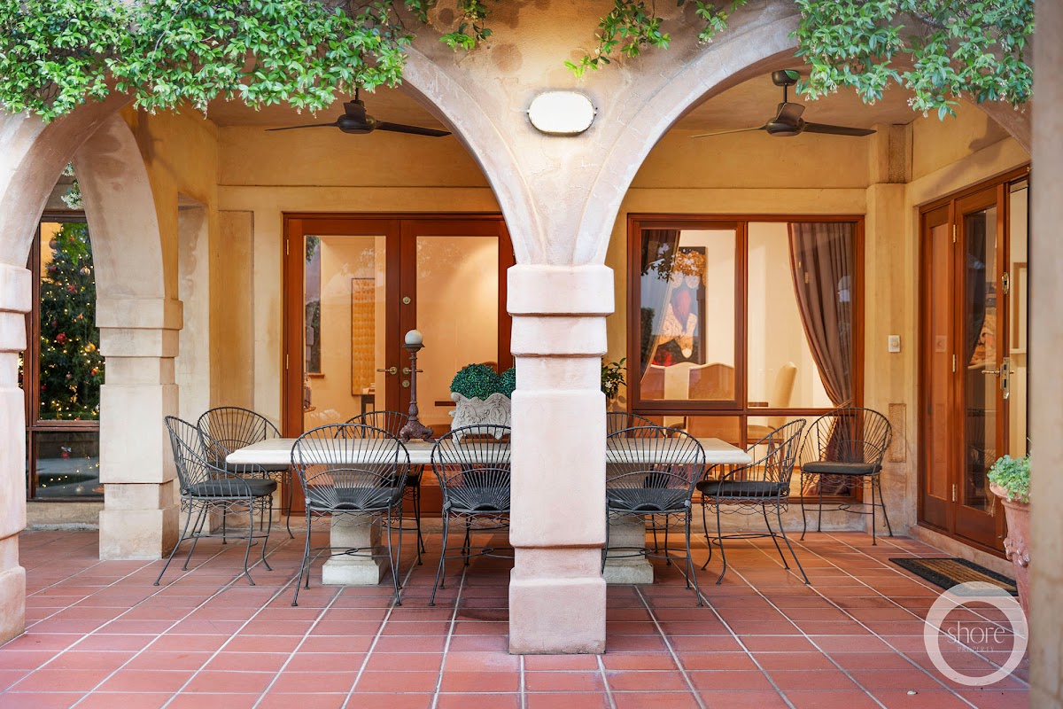Alfresco dining is under the shade of the historically influenced and European inspired, arched loggia.