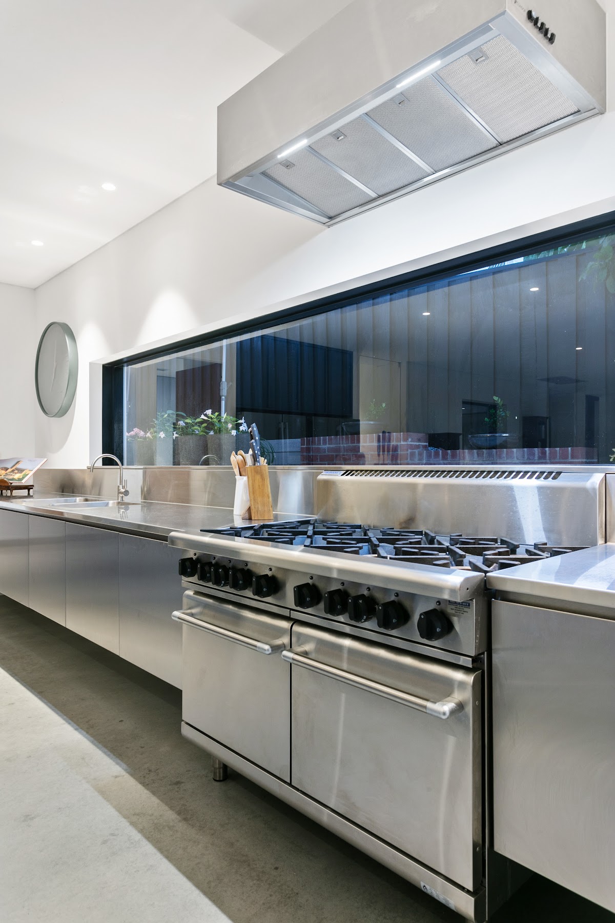 A commercially inspired kitchen is truly generous in every way. A sweeping Turkish marble island bench traverses a wide expanse and is sure to become the social hub of your family home, with room for different family members to simultaneously engage in food prep, homework, catching up on emails, reading the paper and conversation together! The natural warmth of this countertop is accentuated and amplified by the more clinical concrete and steel surrounds. Appliances are a Waldorf 8 burner commercial stove, with two gas ovens and twin dish drawer dishwashers. Back of house is a cavernous combined larder, scullery and wine store. Outside, just off the kitchen there is also a big vege patch / herb garden / kitchen garden area.