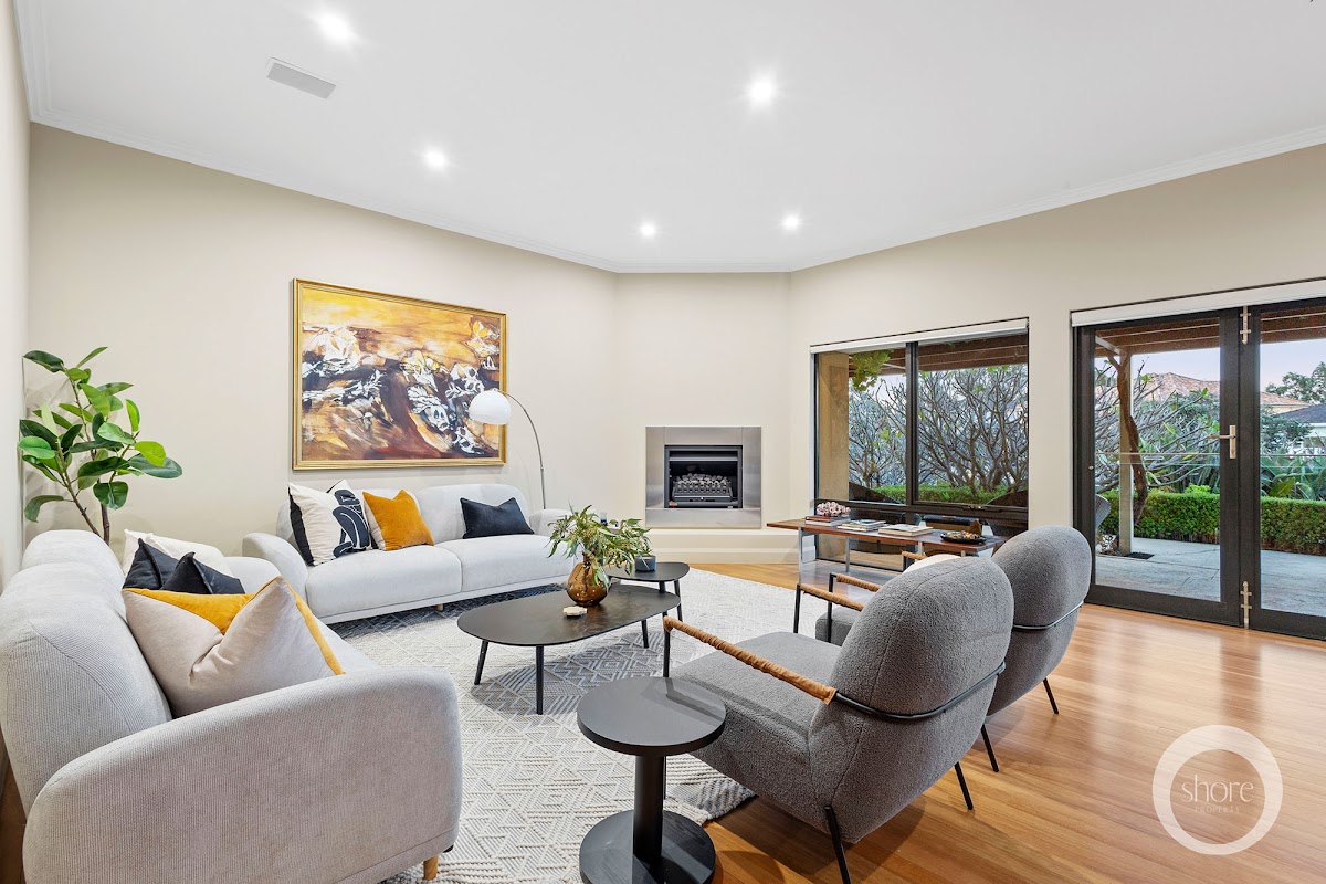 Internal architecture and hardware are high-end at every turn. Warm timber boards are under foot, quality cabinetry and joinery are throughout, and there is generous use of stone. The warmth of an open gas fire crackles during the wintertime, creating alluring ambience.