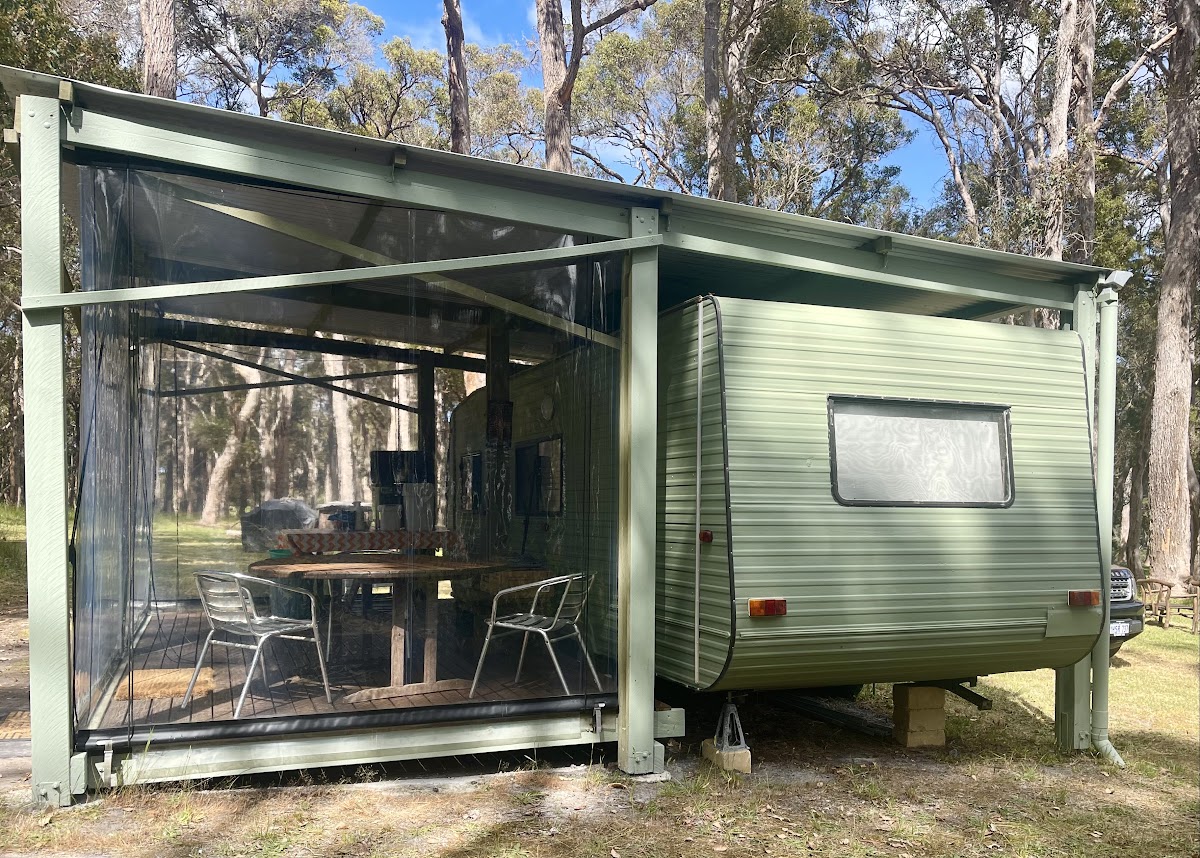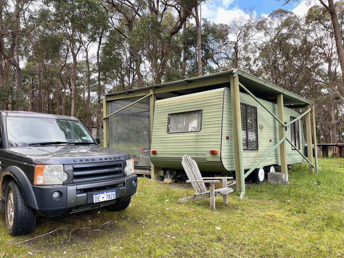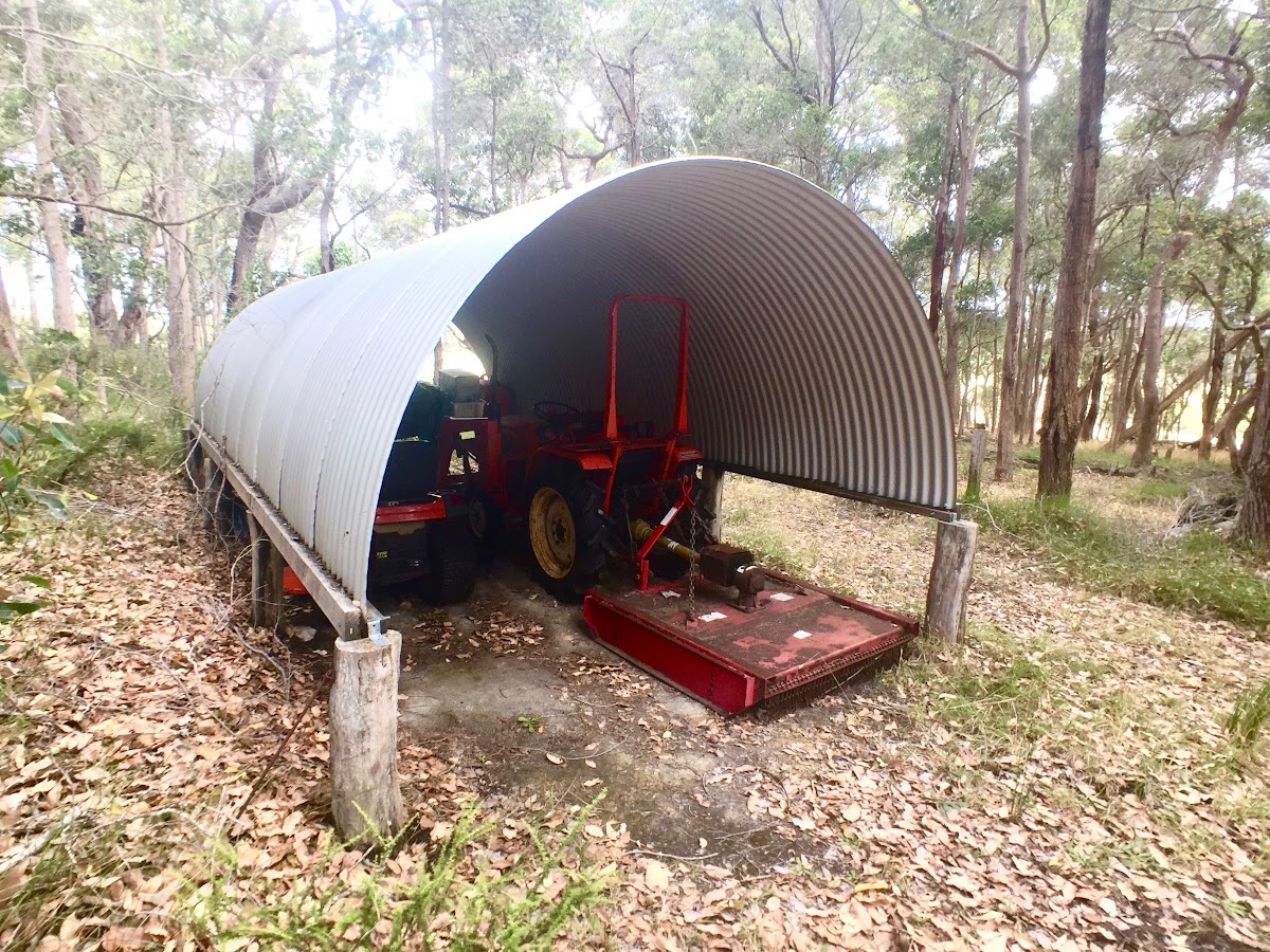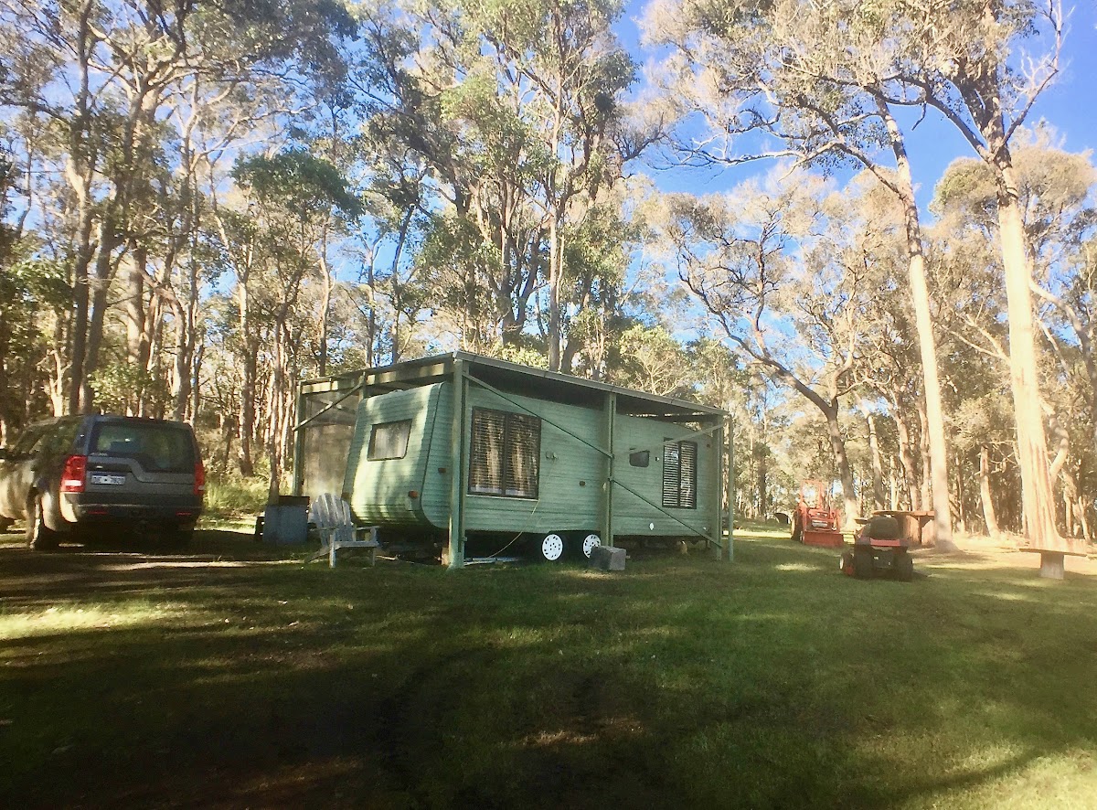 Cute temporary accommodation of onsite van, with under cover timber decked annexe and cafe blinds, is complimented with ablution blocks and under cover carport for machinery etc.