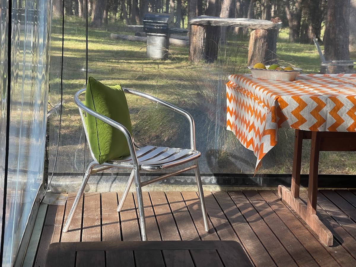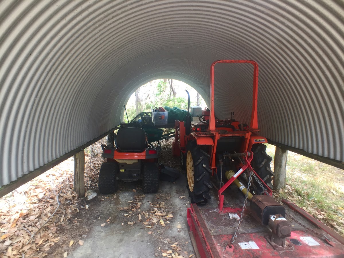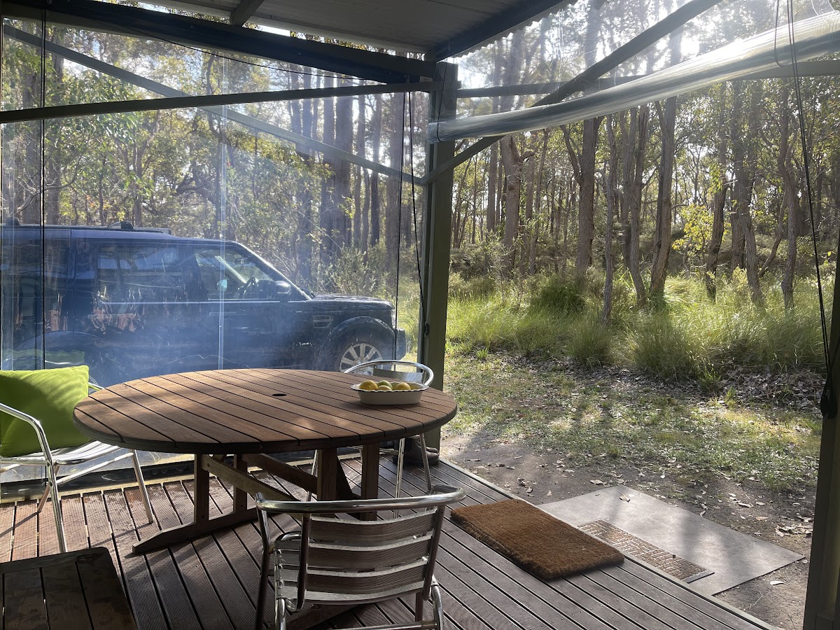 Cute temporary accommodation of onsite van, with under cover timber decked annexe and cafe blinds, is complimented with ablution blocks and under cover carport for machinery etc.