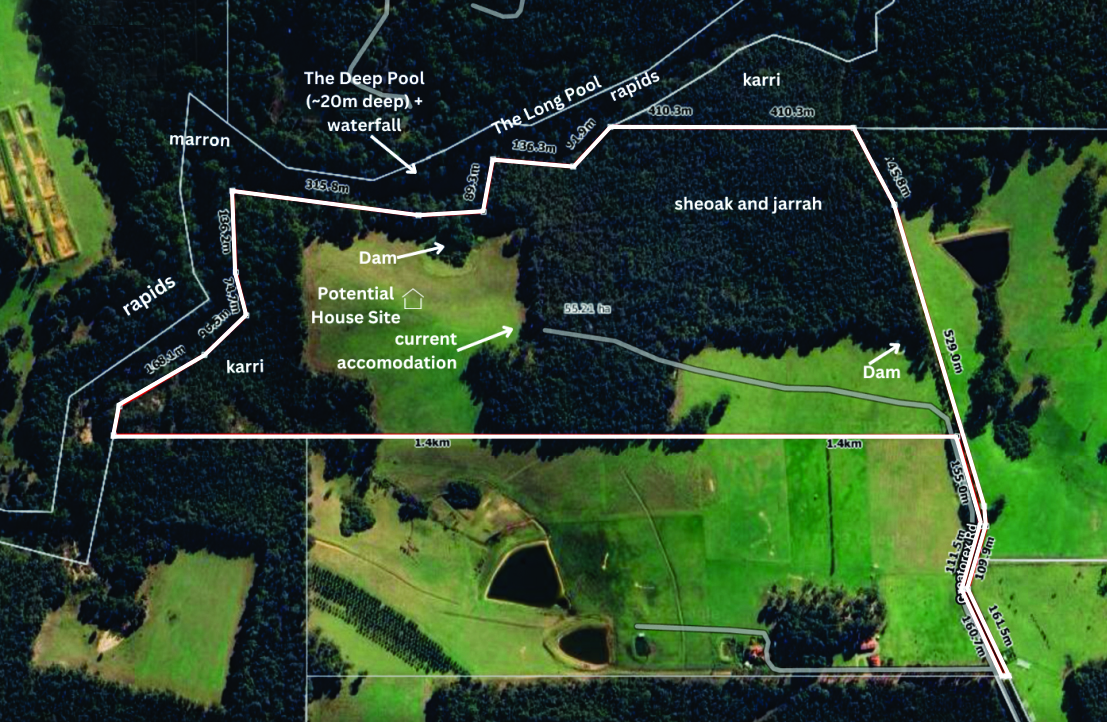 With around a kilometre of river frontage which includes deep pools and swimming holes, rapids and waterfalls and abundant Marron and Black Bream fishing, the most remarkable of lives awaits you here.