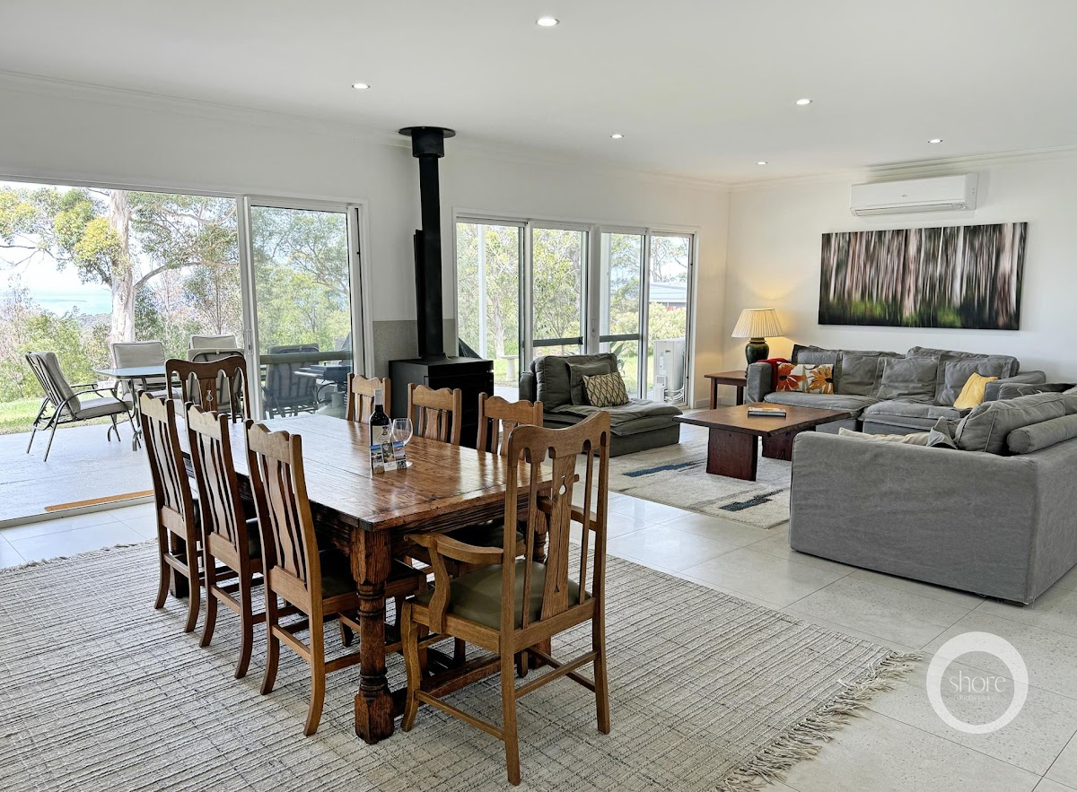 2 double sliding glass doors to the great outdoors where there is a honed concrete, undercover al-fresco area, furnished for relaxation and outdoor dining, complete with a barbecue grill for those delightful cookouts. This amazing outdoor living space enjoys expansive views over the Wilson Inlet through the spectacular Karri trees lining the property.