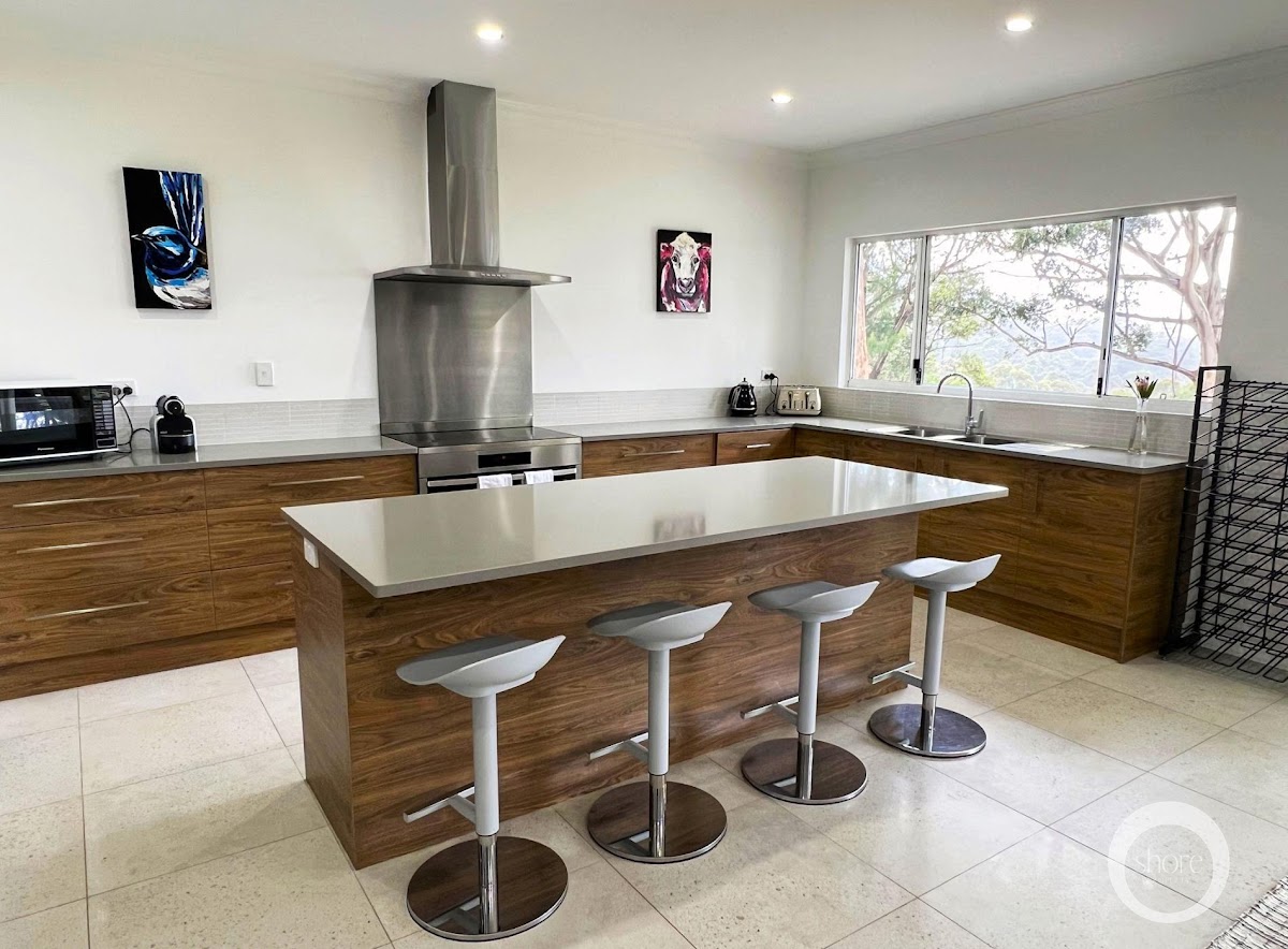 Internally, the luxury kitchen has a separate pantry and a large feature island bench/breakfast bar where all the work is done. Moss coloured Essastone bench tops and horizontal grain walnut base units have been carefully selected in a colour scheme to harmonise with the beautiful setting.